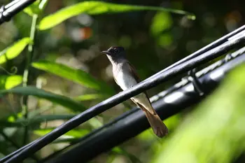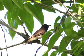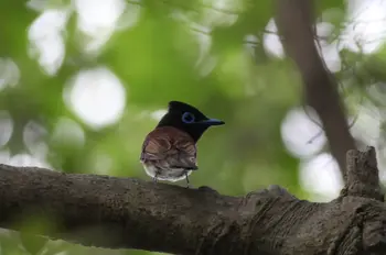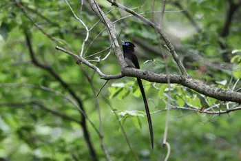 全長45cm(オス)、17.5cm(メス)。小さな冠羽があり、目の周りとくちばしはコバルト色をしています。日本では本州・四国・九州・沖縄に夏鳥として渡来し、平地から低い山のうす暗い林で繁殖します。さえずりが、「ツキ(月)ヒ(日)ホシ(星)ホイホイホイ」と聞くことができるところから、三つの光、三光鳥の名がつきました。うすぐらい森の中で、オスは30cmもの長い尾をひらひらさせて飛ぶ姿は、まるでまぼろしのよう。5月ごろ渡来して日本で繁殖、秋、南方へ渡ります。春に渡ってきたときはすでにオスの尾は長いのですが、秋に渡るとき、長い尾は無くなっています。