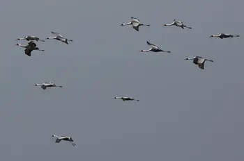全長127cm。翼を広げると2.1mほどある大型の鳥ですが、くちばし、首、足も長い背も高い鳥です。日本では冬鳥で全国から記録はありますが、九州以外ではごく少数です。水辺の小魚、カニ、カエルなど小動物や、草の根や実を食べています。鹿児島県出水平野に飛来する他、九州北部では通過するものが見られます。出水荒崎は、世界でも屈指の一大越冬地として知られ、給餌場での大群は見ものです。他の地方ではごくまれな鳥。10月、稲作のあと片づけが終るのと前後して、夜、数10羽単位で到着し、11月ともなれば海沿いの干拓地(現況は水田や畑)はマナヅル、ナベヅル、少数のカナダヅル、クロヅルなど、ツルたちで埋めつくされます。マナヅルは、その肉がおいしいので真菜(まな)ヅルと呼ぶようになったとか。