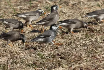 全長24cm。全身は黒味のある褐色で、頭は灰色がかった黒褐色。目の周囲から頬にかけて不規則な白斑があります。この白斑は個体によって違っていることが普通です。くちばし、足は黄色です。飛んだときに、腰の白さが目立ちます。若鳥は全身の黒味がなくて、褐色をしています。地上を歩いて餌を探すことが多く、その時にはくちばしを草株の間に入れて開くことで、地面や草株にひそむ虫を探しています。「リャー リャー」とか「キュリリッ」といった声を出します。巣は樹洞の他、建物の隙間を使うことも多いので、巣箱もよく利用します。アジア大陸の中緯度、温帯に分布していて、冬には南へ移動するものもいます。日本では九州以北で繁殖していて、北海道では夏鳥です。平地から低山地の人家や人家近くの林で繁殖し、農耕地、公園の芝生、草地などでよく見られます。繁殖が終わると群になり、多い場合は数万羽の群になることもあります。駅前のロータリーや街路樹並木を塒(とや:鳥の巣)にして、人に嫌われることも多いですが、農耕地や草原で虫をとるプロフェッショナルですから、畑や芝生のグランドキーパーの役目をしてくれています。
