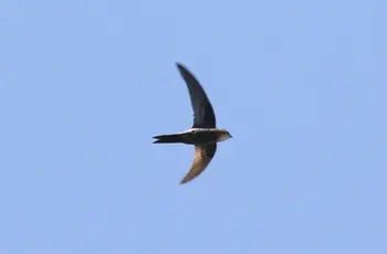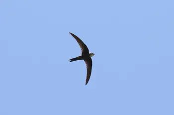 全長19.5cm、翼を広げると43cmにもなります。飛びながら眠ることも出来るほど、空中を飛ぶことに特化した鳥で、長い翼で自由自在に、しかも高速で飛んでいます。ツバメの仲間(スズメ目ではなく、アマツバメ目)で、類縁関係は遠いグループですが、空中で飛ぶ虫を捕えるという生活が似ているために、姿が似てきた例になります。頭上を飛ぶ姿を見ると、鎌の形に見えるので、鎌燕と呼ぶ地方もあります。体全体は褐色味のある黒色で、腰ははっきりと四角形に白色に見えます。脚はかなり短くて、指はいずれも前を向いていて、爪で崖にぶら下がるように止ります。巣は崖の隙間の奥にある棚に枯草を少量積んでつくります。群性が強く、繁殖地でも渡り途中も群れでいるのを見ることの多い鳥です。翼が長いために地上に下りてしまうと、飛び立つことが出来ません。そこで、崖に縦に止り、重力も利用して落ちるように空中へ飛び立ちます。アジアの東部に分布し、日本では夏鳥として渡来し、北海道・本州の山岳の崖地、海岸の崖地で繁殖しています。「チリリリー、ジリリリー」と聞こえる声で鳴きます。