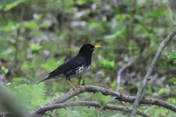 全長21.5cm。オスは頭から背・尾・翼の上面は黒色、胸・腹は白色で小さな斑点を持っています。くちばし、脚は黄色。メスはオスの黒い部分は、暗褐色です。ユーラシア大陸の極東部に棲息する分布が狭い種。日本では夏鳥で、九州以北、北海道までの山地・低山地の広葉樹林を繁殖地にしています。「キャァ キャァ キョコ キョコ キーキ キーコ キーコ」などと大きな明るい声で鳴き、これを何度も繰り返してさえずります。ヨーロッパのblack bird に匹敵する、日本の代表的な歌鳥といっても良いでしょう。ミミズや昆虫類などを地上で探し、餌にしています。