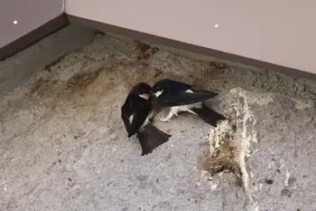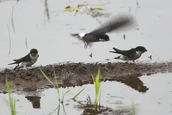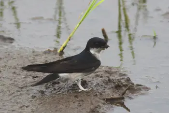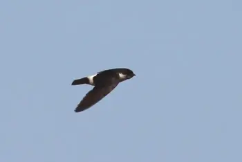 全長14.5cm。ツバメの仲間ですが、小柄。頭から背、翼の上面、尾の上面などは黒色。喉から胸、腹など下面は汚れた白色。腰は四角形に白色をしていて飛んだ時に目立ちます。脚、指には細い白い羽毛が生えています。メスオス同色。日本では夏鳥として渡来し、全国で繁殖していますが、九州では越冬するものもいます。山地や海岸の崖地、洞窟の入り口あたり、橋、建物などの人工物にも巣をつくり、繁殖します。群性が強く、繁殖も集団で行います。口は横に大きく開くがまぐち型をしていて、空中を飛行する虫類を食べています。「チリリッ」あるいは「ジュピッ」などと聞こえる声で、飛びながら早口で鳴いています。はばたきを止めて滑るように飛ぶ飛行をよく行います。地上へ下りるのは巣材の土を集める時だけ、その時には脚に生えている白い短い羽毛をよく見ることができます。本来自然の崖地に巣をつくっていたのでイワツバメですが、最近ではコンクリツバメと呼んでもいいかと思うほど、人工構造物で見ることが多くなりました。
