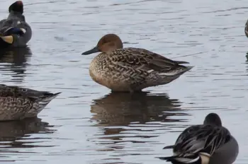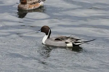 全長75cm(オス)、53cm(メス)。オスの頭はチョコレート色、白い胸から首の側面に白線が食い込んでいます。体は灰色で、細かい黒色模様があります。オスでは尾羽の中央羽2枚が長く、Pintailの英名はこの尾から名付けられています。メスは全体に褐色で黒褐色の斑紋があります。他種のカモ類のメスより白っぽく見えますし、尾も長めです。脚は黒灰色、くちばしも黒灰色で、オスは側面が青灰色。警戒の時などは「シィー シィーン」という声を出しますし、「プルッ プルッ」と聞こえる声もよく出します。ユーラシア大陸、北アメリカ大陸の北部ツンドラ地帯で繁殖し、冬にはそれぞれが温帯域へ渡ります。日本では冬鳥で、本州以南は冬期に見られ、北海道では春秋の渡り時期に通過します。湖沼、河川、干潟など広い水面に生息し、草の種子、水草の葉・根、底生生物などを食べています。他のカモ類より首が長いので、逆立ちして水底の餌を探す姿をよく見ます。