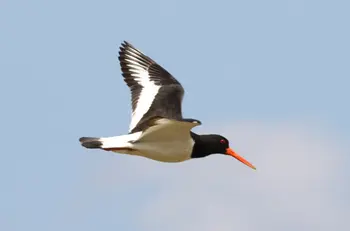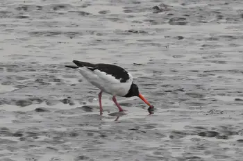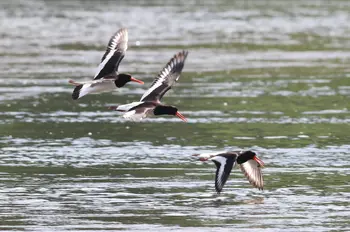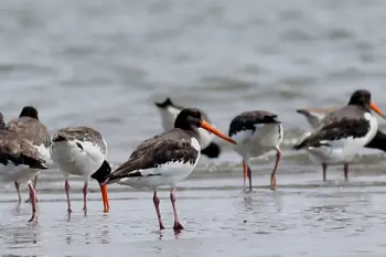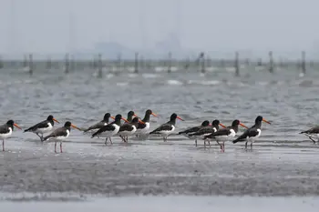 全長45cm。赤白黒の目立つ色彩のチドリの仲間、メスオス同色です。頭から背、翼の上面は黒色で腹は白色。飛行時には翼に太い白帯が出るほか、腰は白色。尾も白く、黒い帯があります。くちばしは赤色で、太く見えますが、正面から見ると上下くちばしとも横から押されたように薄い形。脚は桃赤色。群性があり、同種でばかり群をつくっていることが多いように思います。ユーラシア大陸中部と極東部の沿岸に分布・繁殖しています。日本では冬鳥で、主に干潟や砂地の海岸に渡来します。二枚貝類を主食にしていて、捕えた貝を砂地に立てて、薄いくちばしでこじあけて中身を食べています。