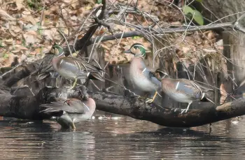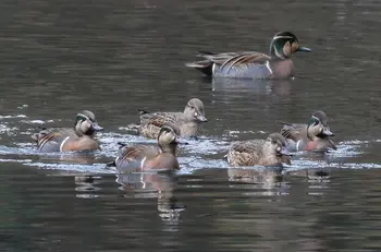 カモの仲間としては小型種。背は褐色で、翼をたたんだ時に肩のあたりから数本の飾り羽が下がって見えます。脇は白羽に細かい黒線が多数あるため、灰色に見えます。胸は赤味のある淡紫色をしていて、斑点が沢山あります。メスは全体が褐色で、黒褐色のまだらになっていて、他の水面採餌カモ類のメスと色彩、模様がよく似ていますが、くちばしの付け根に白色の斑がでるので、コガモのメスとは容易に区別できます。