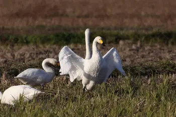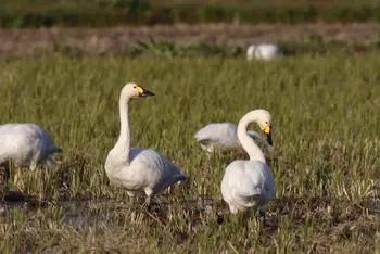 全長120㎝。全身白色、大型の首の長い水鳥で、ガン、カモの仲間。くちばしは黒色で、基部に黄色・橙黄色の部分があります。よく似たオオハクチョウの基部の黄色より小さめです。オオハクチョウとは違い、上くちばし基部の上面が黄色くなるものもかなりいます。脚は黒色。首を真っ直ぐに伸ばして飛行し、短い脚は尾をこえて後方へ出ません。生態はオオハクチョウによく似ています。「コホッ コホッ」あるいは「オホォッ オホォッ」 と聞こえる、オオハクチョウよりも低い声で鳴きます。幼鳥は全身薄汚れた灰色に見えます。