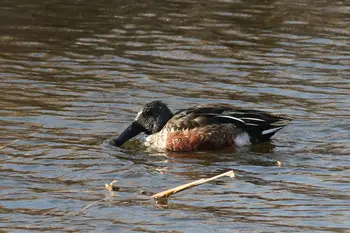 全長51㎝(オス)、43㎝(メス)。長いヘラ型のくちばしをしたカモの仲間。英名はshoveler。オスは頭が緑色、背は白色と黒色の模様、胸は白色、腹・脇は赤褐色、尾は白色。この色彩を覚えれば、間違えることはないでしょう。メスは全体が褐色で、黒褐色の斑が全体にあります。くちばしは、オスが黒色、メスが黄褐色。くちばしの側面には歯を思わせるくし状のものがあり、このくちばしを水面に付け、水を吸い込み、水とともに入ってくる植物プランクトンなどを濾しとり、水を排出します。水面を泳ぐ脚の動きで水を撹拌するため、植物プランクトンが水面近くへ動き、それを狙った次の個体が後方へ並びます。そのため何十羽も集まると、大きな渦になっているのがわかります。脚は橙赤色。