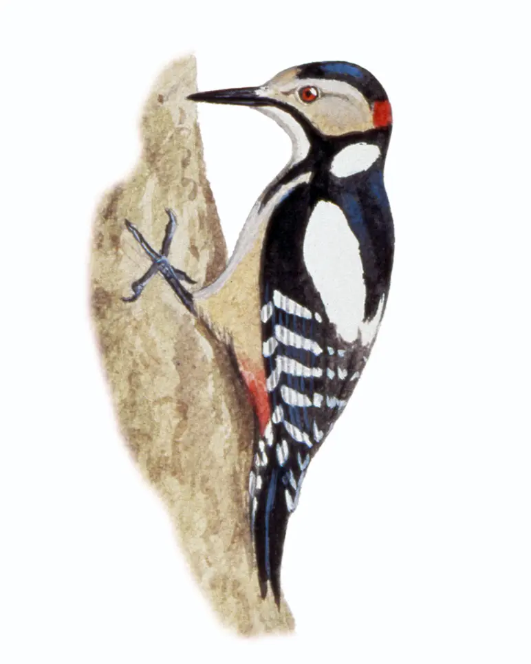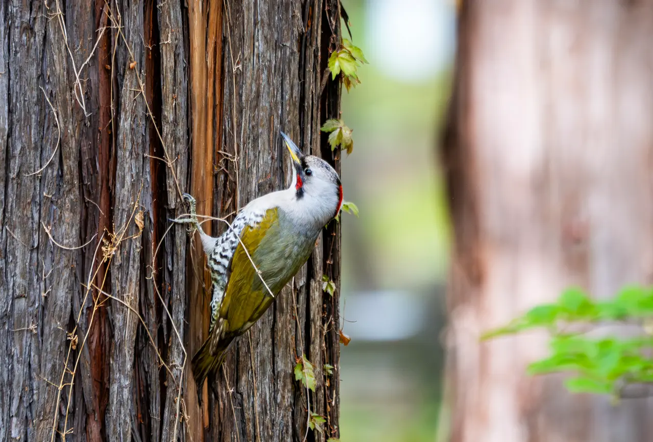 キツツキは繁殖期になると、木の幹をくちばしでつついて削り、丸い入り口をもつ深い穴を掘って巣をつくります。繁殖期以外にも、キツツキの種によっては、夜に安心して眠るためのねぐら用の穴も自分で掘ります(※)。