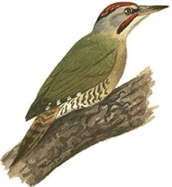 緑色した中型のキツツキで、本州、四国、九州にしか分布しない日本の固有種です。オスは頭頂部全体が赤く、メスは後頭部だけが赤い色をしています。緑色なのにアオゲラという名前は、古くは緑を青と呼んでいたことに因み、江戸時代中期にはこの名前で呼ばれていたそうです。「ピョー、ピョー」と口笛のような音色の大きな声で鳴きます。
