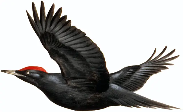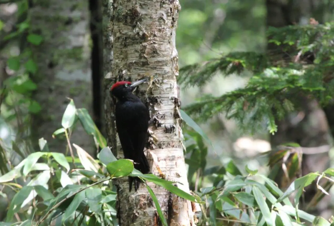 日本最大のキツツキで、カラスほどの大きさがあります。全身が黒く、オスは頭頂部全体が、メスは後頭部が赤い色をしています。名前のクマは動物とは関係がなく、大きいという意味。大きなキツツキ=クマゲラという名前になったと言われています。ユーラシア大陸に広く分布し、日本では北海道と東北地方北部に生息。国の天然記念物、絶滅危惧種に指定されています。