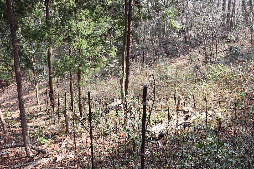 病虫害対策を見る意外かもしれませんが、こんなに都会に近い森なのに、やはりここでもシカが増えています。そのため、植樹した苗がまだ小さいエリアや、ナラ枯れ後に広々と空間が空いてしまったエリアなどを柵で囲って、シカから守っています。