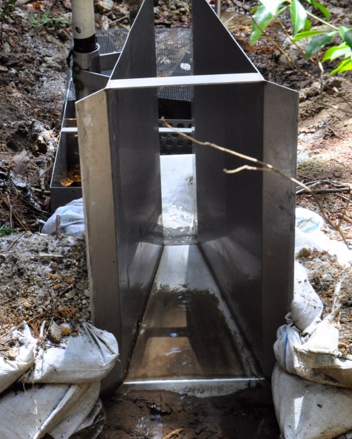 林の外の雨量と林内の雨量、木の幹を伝って流れてくる樹幹流を計測し、林の状態が湧水量にどのような影響をもたらすかを調べます。