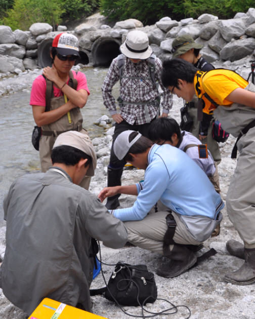 河川の上流域から下流域までの広範囲で、川の流量を調べます。流域に降った雨量の情報などと共に、地下の水の流れを知る基本的なデータとなります。