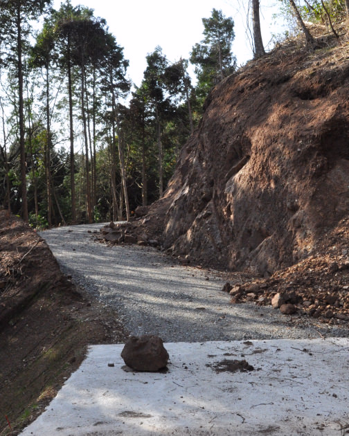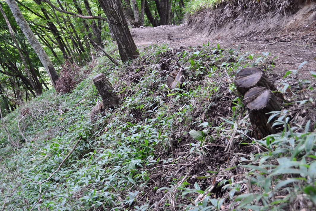 実はこの山は、富士山の噴火で吹き出した火山灰と、スコリアと呼ばれる小さな軽石の層が交互に重なっており、作業道などをつくって地面を剥き出しにしてしまうと、軽石層が、あっという間に水で削られてしまうのです。