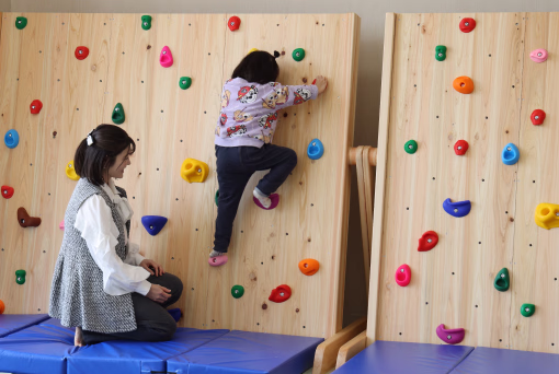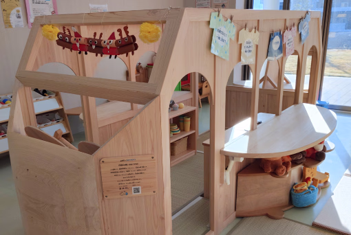 「天然水の森 阿蘇」で伐り出された「育林材」(ヒノキ)は、地元の「木育工房」の手によって、子ども用遊具(クライミングパネル、飛行機型キッチンカー)に生まれ変わりました。2025年3月に竣工した熊本県益城町の地域共生センター「カタル」のキッズプレイルームに設置し、町のみなさんにご利用いただいています。