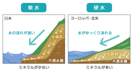 また、ヨーロッパや北米のように大陸の中をゆっくり移動する水は、それだけ地層と接触する時間が長いため、より多くの硬度成分を含む傾向があります。日本のように地形が急峻な国の水は、地層にとどまる時間がたいへん短く、それが日本の水を軟水にしている大きな要因の一つとなっています。