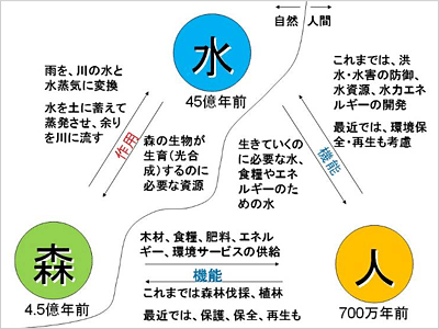 森と水は、私たち人類が地球上に登場するずっと以前から、互いに切っても切れない関係を築いてきました。森には降った雨(水)を一時的に土に蓄えて、木々の光合成の際に蒸発させ、その残りを湧き水という形で川に流すという働きがあります。つまり森にとって水は生きていくために不可欠な資源であると同時に、水にとっても森は雨を水蒸気や川の水に変換してくれる水循環システムの一端を担っている重要な存在だということになります。