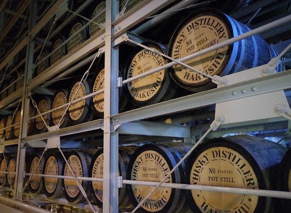 白州蒸溜所ではラック式の貯蔵庫を採用しているので、同じ貯蔵庫内でも、樽の置かれた位置の高低差によって温度や湿度が異なります。