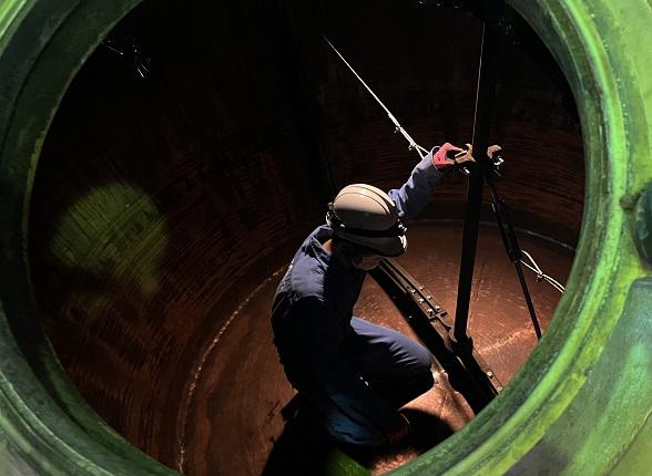 山下「蒸溜釜のメンテナンスや修繕が必要な部品の交換、釜全体の入れ替えなどを行いました。製造を休止してのメンテナンスなので、釜の外観からだけでなく実際に蒸溜釜の中に入って点検作業を行います。例えば、加熱による内部の焦げつき方をみてラメジャー*形状の設計変更を行ったり、釜のすり減り具合など経年劣化の状況を確認して交換時期を予測するなど、今後のメンテナンス計画を立てたりします。」