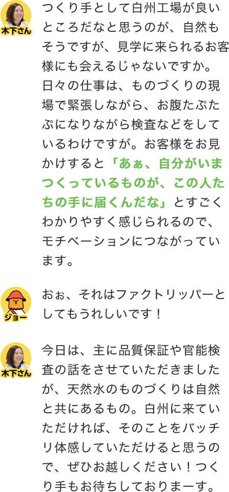 今回3人が訪れたのは、天然水南アルプス白州工場。「品質保証部門」の木下さんに突撃インタビューです。