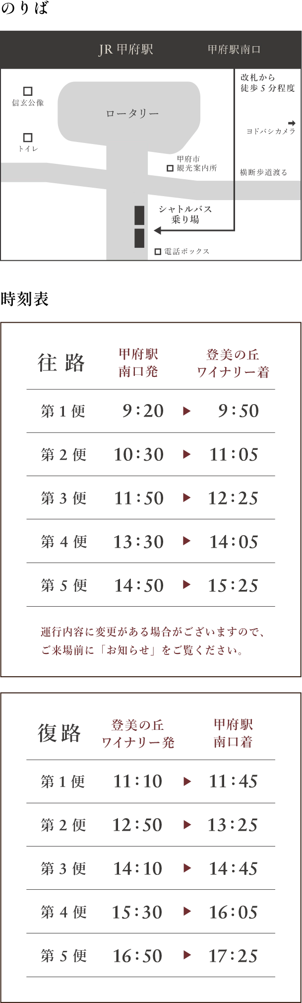 JR甲府駅南口「貸切バス専用のりば」より金・土・日・祝日限定で無料のシャトルバスを運行しています。
