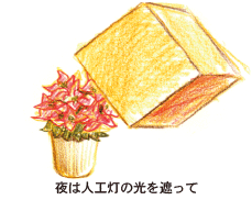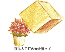 プリンセチアは短日(日長時間10時間程度以下)で葉が色づく植物です。室内灯や街灯などの人工灯に影響されない自然日長下でしたら11月下旬〜12月上旬頃に色づきます。人工灯に影響されてしまう場所でしたらダンボールなどをかぶせ短日処理を行うことで色づかせることができます。