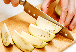 フライパンににんにく、唐辛子、サラダ油を入れて弱火でじっくりと熱し、香りがたったらなすを加え、柔らかくなるまで中火で揚げ焼きにする。