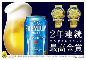 サントリービール(株)の「ザ・プレミアム・モルツ〈香る〉エール」は、世界的な酒類・食品などのコンテスト、第58回「モンドセレクション(MONDE SELECTION、本部:ベルギー ブリュッセル)」ビール、水&ノンアルコール飲料部門で最高金賞(GRAND GOLD MEDAL)を受賞しました。昨年も同コンテストで最高金賞を受賞しており、2年連続での受賞となりました。なお、授賞式は6月3日(月)(現地時間)にイタリア ローマで行われます。