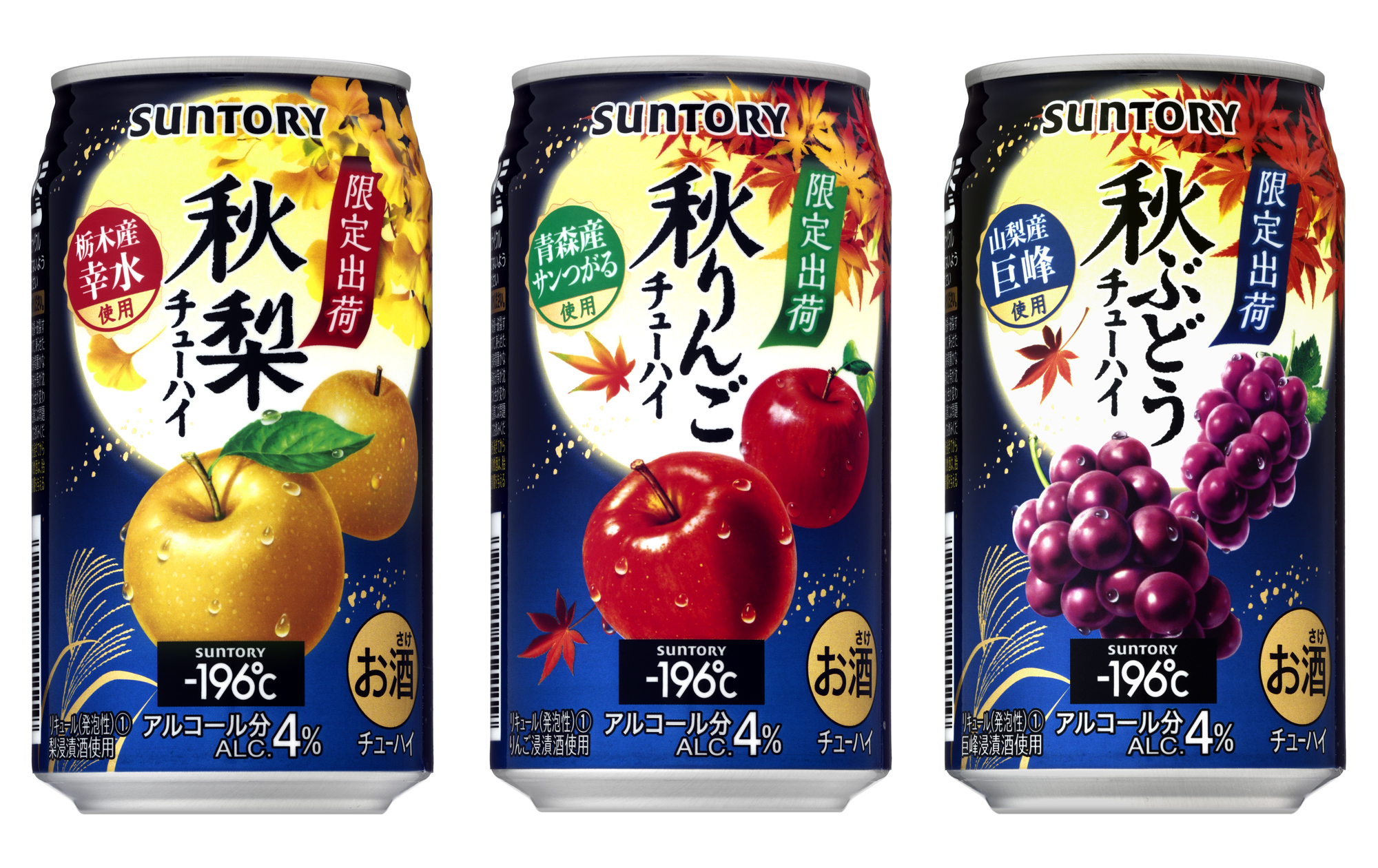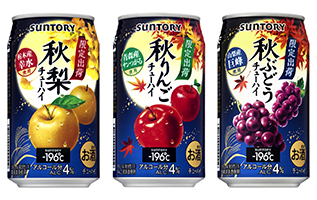 サントリースピリッツ(株)は、「-196℃〈秋梨〉」「同〈秋りんご〉」「同〈秋ぶどう〉」を8月13日(火)から全国で秋季限定新発売します。