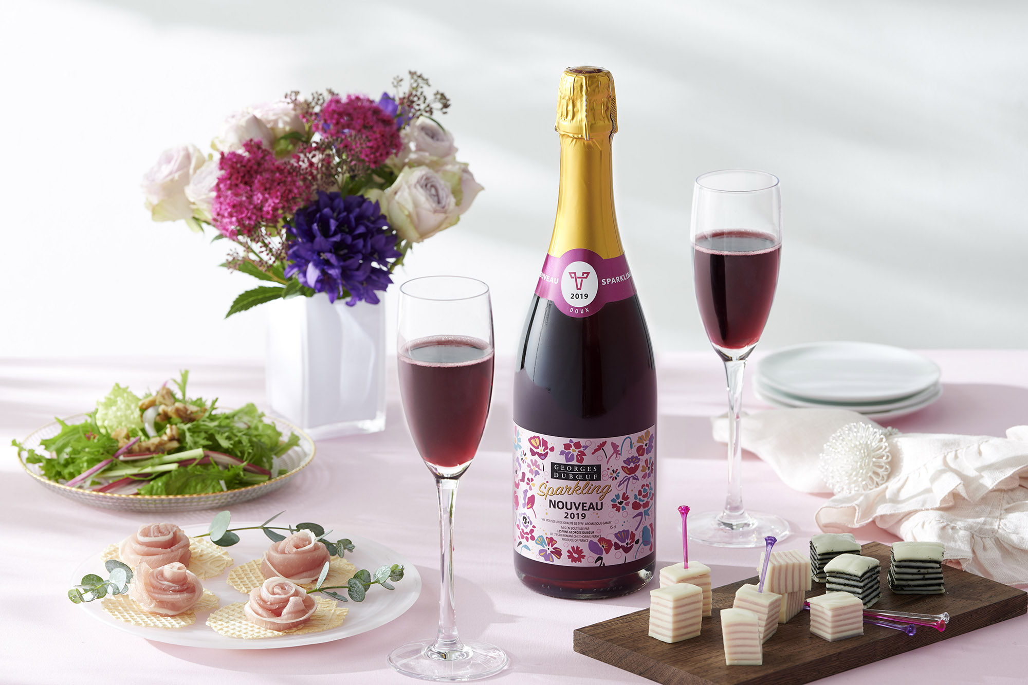 甘い味わいのエレガントな「ジョルジュ デュブッフ スイーツ パーティ ヌーヴォー」は、そのままでも、氷を入れても、おいしく楽しんでいただけるような味わい設計にしました。フルーティな味わいと華やかなデザインが、解禁のお祝いムードを一層盛り上げます。