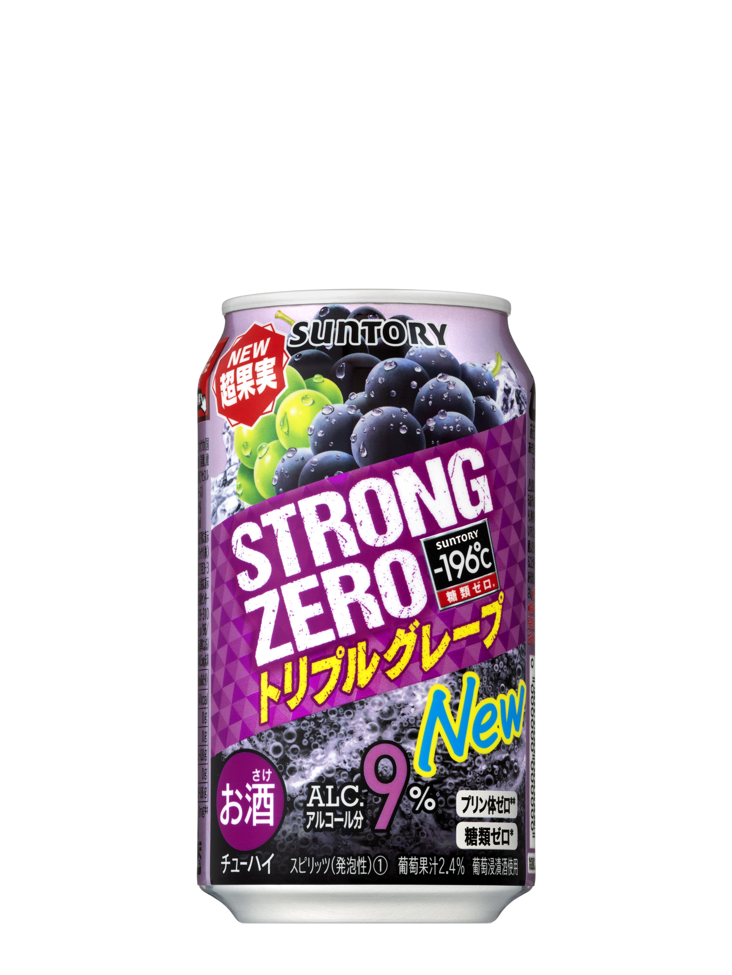 当社独自の“-196℃製法”による果実まるごとの凍結粉砕浸漬酒、果汁に加え、〈トリプルピーチ〉は果実を漬け込んだお酒を、〈トリプルグレープ〉は赤ワインを使用しました。しっかりとした果実味とアルコール度数9%の力強い飲みごたえが特長です。パッケージは、果実の大きなイラストで中味の特長をわかりやすく表現し、“New”を大きくあしらい新商品であることを訴求しました。