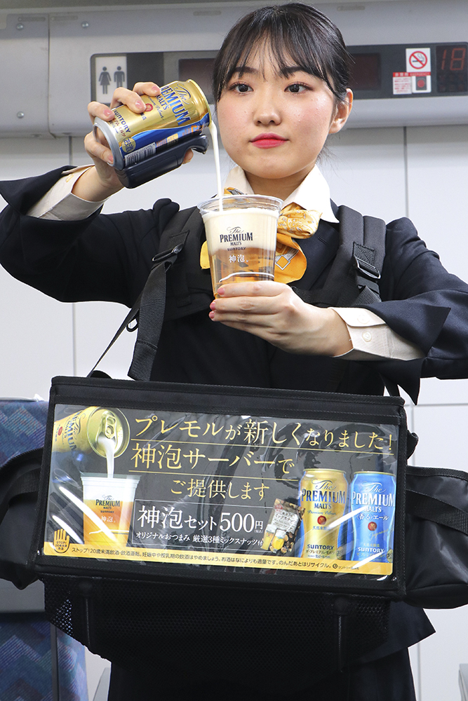 2月18日(火)から8月31日(月)までの期間限定で、東海道新幹線の一部列車にて、専任のパーサーが「神泡サーバー2020」で注いだ“神泡”の「ザ・プレミアム・モルツ」または「同〈香る〉エール」とオリジナルおつまみをセットにした「神泡セット」を販売します。
