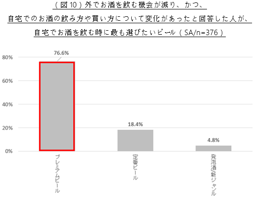外でお酒を飲む機会が減り、かつ、自宅でのお酒の飲み方や買い方について変化があったと回答した人に、自宅でお酒を飲むときに最も選びたいビールについて質問したところ、76.6%の人がプレミアムビールと回答しました(図10)。