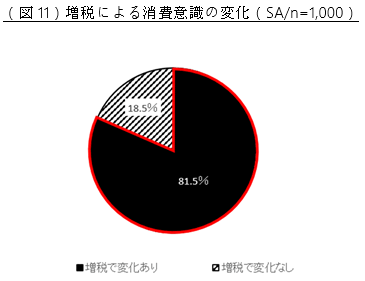 2019年10月の増税以降、消費に関する意識に変化があったかを質問したところ、81.5%の人が「増税で変化あり」と回答しました(図11)。