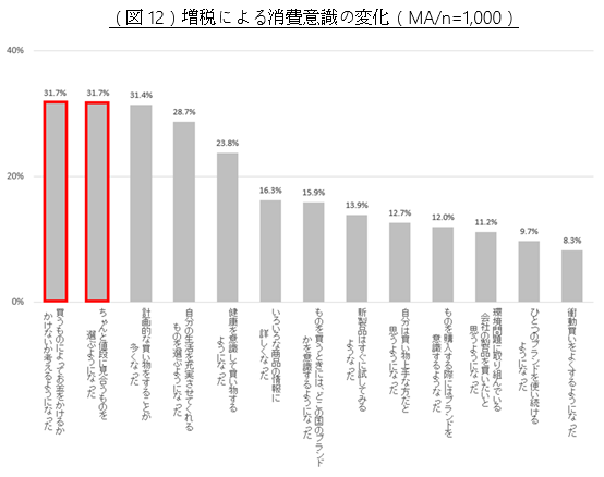 また、増税前後での消費に対する意識の変化について質問したところ、「買うものによってお金をかけるかかけないか考えるようになった(31.7%)」「ちゃんと値段に見合うものを選ぶようになった(31.7%)」が第1位になりました(図12)。