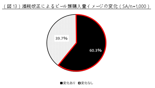 酒税改正後、その影響を受けてビール類の購入量に変化がありそうかを質問したところ、60.3%と半数以上が「変化あり」と回答しました(図13)。