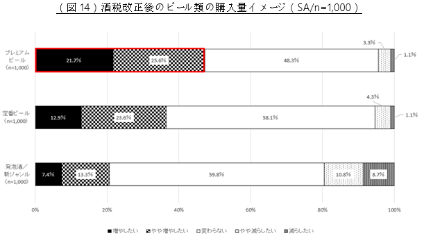 また、酒税改正後のビール類の購入量に対する意識の変化について質問したところ、プレミアムビールの購入量を増やしたいと回答した人は47.3%と、他のビール類に比べ高いスコアとなりました(図14)。