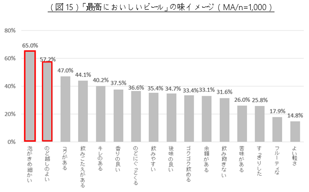 最高においしいビールの味イメージについて質問したところ、第1位「泡がきめ細かい(65.0%)」、第2位「のど越しのよい(57.2%)」と続きました(図15)。