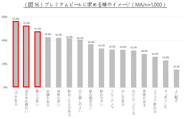 プレミアムビールに求める味のイメージを質問したところ、「コクがある(55.9%)」「泡がきめ細かい(51.9%)」「香りの良い(47.2%)」が上位となりました(図16)。