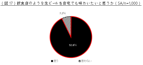 飲食店のような生ビールを自宅でも味わいたいと思うかを質問したところ、味わいたいという人が92.8%と大多数を占めました(図17)。外での飲酒の機会は減っているものの、飲食店のような生ビールの味わいを求める方が多いようです。
