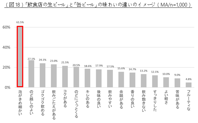 また、「飲食店の生ビール」と「缶ビール」の味わいの違いは何かと質問したところ、「泡がきめ細かい(61.5%)」が2位以下に大きく差をつけて1位になりました(図18)。