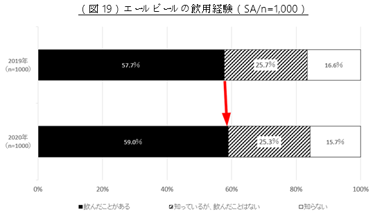 エールビールを飲んだことがあるかを質問したところ、昨年よりも1.3ポイント高い59.0%が、「飲んだことがある」と回答しました(図19)。