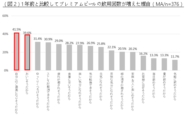 また、1年前と比べてプレミアムビールの飲用回数が増えた理由としては、「自分へのご褒美になりそうだから(41.5%)」「おいしそうだから(39.6%)」が上位になりました(図2)。