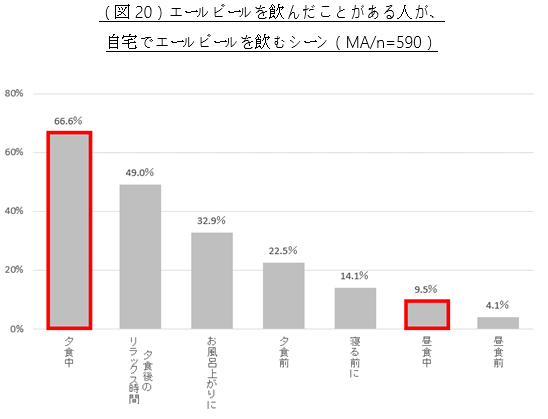 また、エールビールを飲んだことがあると回答した人に、自宅でエールビールを飲むシーンについて質問したところ、「夕食中(66.6%)」が第1位になりました。また、約1割が「昼食中(9.5%)」と回答するなど、食事中に幅広く飲用されていることもわかりました(図20)。