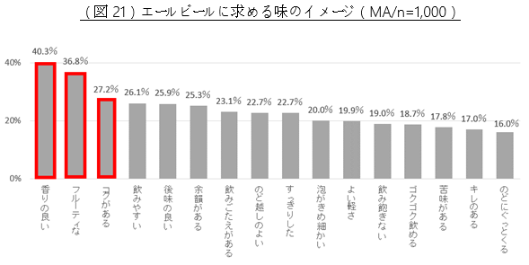エールビールに求める味のイメージを質問したところ、「香りの良い(40.3%)」「フルーティな(36.8%)」「コクがある(27.2%)」と続きました(図21)。