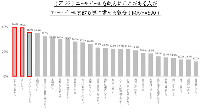 また、エールビールを飲んだことがある人に、エールビールを飲む際に求める気分を質問したところ、「味を楽しめそう(40.2%)」「おいしそう(39.5%)」「ゆっくりくつろげそう(35.4%)」が上位になりました(図22)。