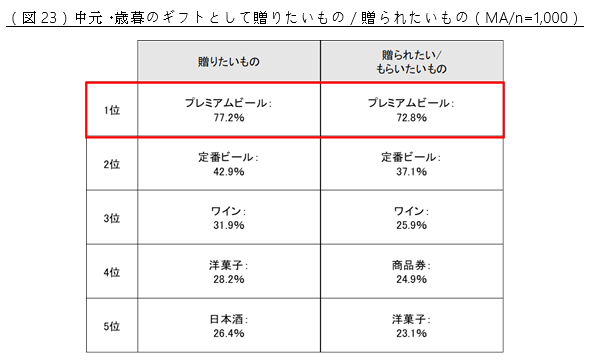 中元・歳暮のギフトとして、贈りたいもの・贈られたいものについて質問したところ、贈りたいものとしては77.2%、贈られたい・もらいたいものとしては72.8%と、昨年同様ともに7割以上が「プレミアムビール」と回答しました(図23)。