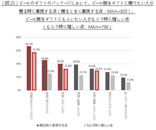 ビール類をギフトに贈りたいという人が贈るときに重視する点、ビール類をギフトとしてもらいたいという人がもらう時に嬉しい点を質問したところ、「品質が良さそうなもの」が、贈る時に重視する点として66.1%、もらうときに嬉しい点として57.3%と、それぞれ1位になりました(図25)。