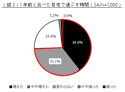 1年前と比べた自宅で過ごす時間の変化を質問したところ、全体のおよそ4分の3が「増えた(74.5%)」と回答しました(図3)。