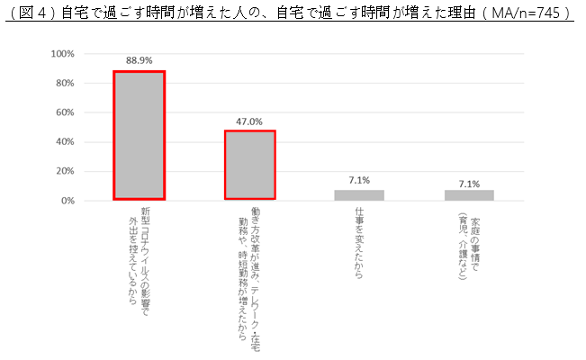 また、自宅で過ごす時間が増えたと回答した人に、その理由を質問したところ、1位が「新型コロナウイルスの影響で外出を控えているから(88.9%)」、2位「働き方改革が進み、テレワーク・在宅勤務や、時短勤務が増えたから(47.0%)」と続きました(図4)。